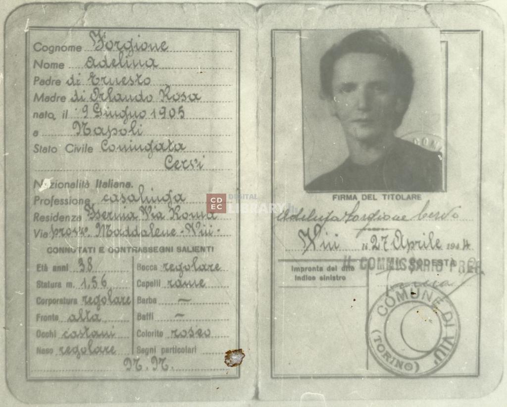 | titolo attribuito | Carta d'identità con false generalità di Lina Foa in Hirsch (alias Adelina Forgione in Cervi) |