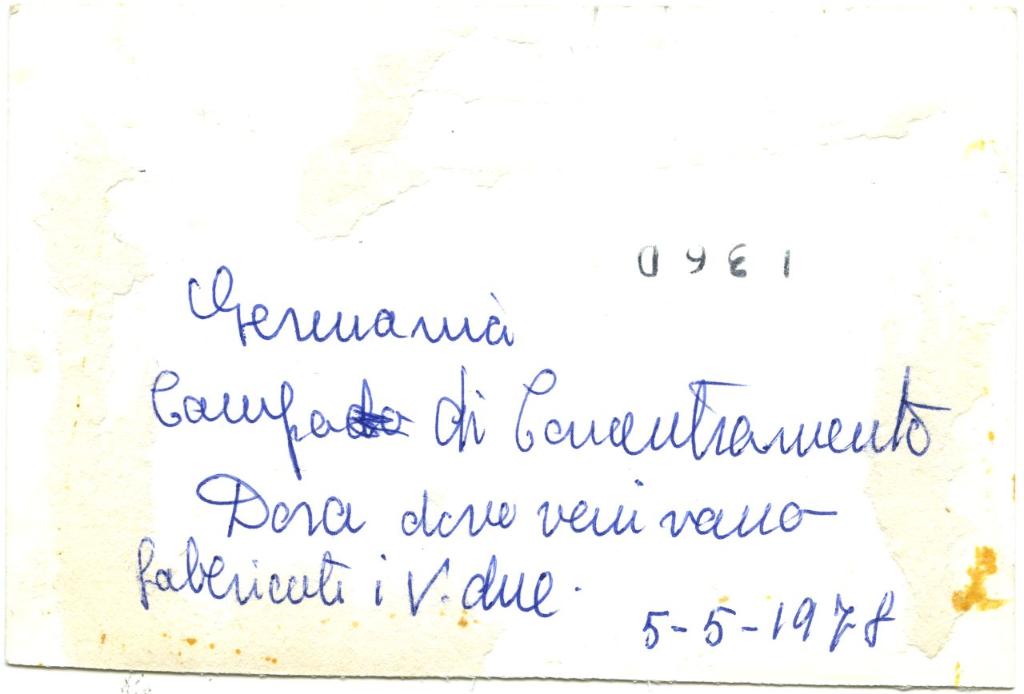 | iscrizioni | sul verso del supporto l'indicazione manoscritta da Frida Misul "Germania/ Campo di Concentramento Dora dove venivano fabbricati i V due/ 5-5-1978" |