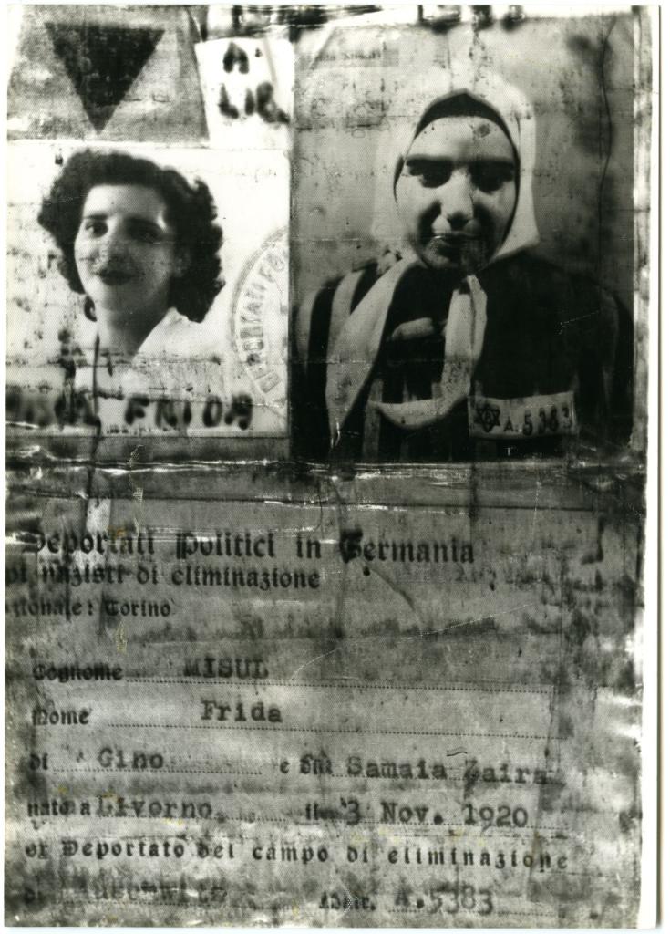 | notizie storico-critiche | La scheda anagrafica dei Deportati Politici in Germani, intestata a Misul Frida, riporta due ritratti fotografici: il ritratto a sinistra fu eseguito prima della deportazione; il ritratto a destra venne scattato durante la permanenza nel campo di concentramento e Frida Misul reca sulla giacca la Stella di Davide seguita dal numero di matricola A. 5383 |