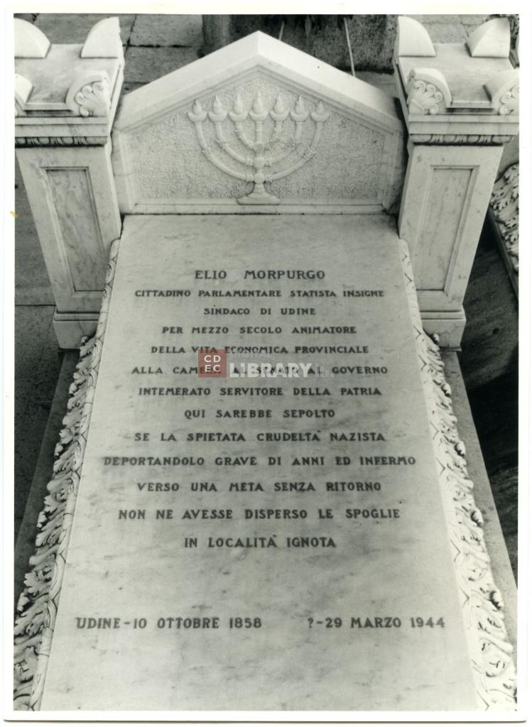 | notizie storico-critiche | La pietra tombale reca incisa la seguente iscrizione: "Elio Morpurgo/ cittadino parlamentare statista insigne/ sindaco di Udine/ per mezzo secolo animatore della vita economica provinciale/ alla Camera al Senato al governo/ intemerato servitore della Patria/ qui sarebbe sepolto/ se la spietata crudeltà nazista/ deportandolo grave di anni ed infermo/ verso una meta senza ritorno/ non ne avesse disperso le spoglie/ in località ignota/ Udine - 10 ottobre 1858/ ? - 29 marzo 1944" Elio Morpurgo venne arrestato il 29 febbraio 1944 e, dopo un periodo di detenzione nel campo della Risiera di San Sabba a Trieste, fu deportato il 29 marzo 1944. Morì durante il trasporto verso il campo di sterminio di Auschwitz. |