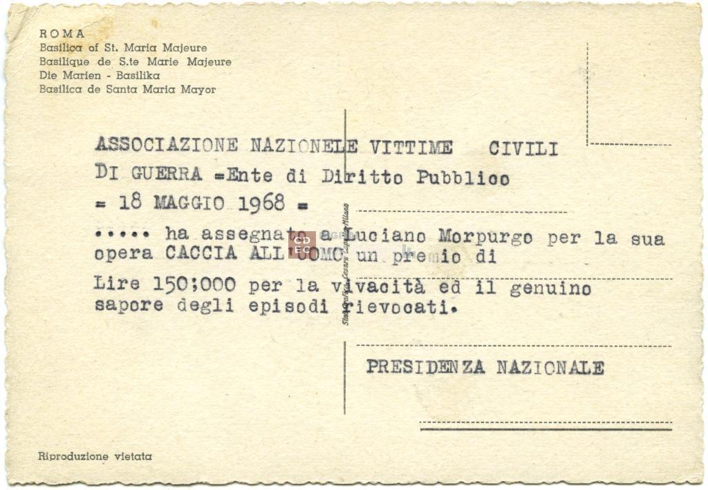| iscrizioni | sul verso del supporto l'indicazione dattiloscritta "Associazione nazionale vittime civili di guerra - Ente di diritto pubblico/ 18 maggio 1968/ ...ha assegnato a Luciano Morpurgo per la sua opera Caccia all'uomo un premio di Lire 150.000 per la vivacità ed il genuino sapore degli episodi rievocati. Presidenza Nazionale" |