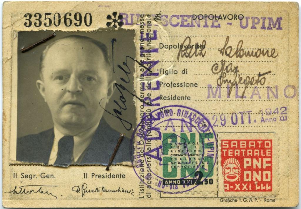 | notizie storico-critiche | La tessera di riconoscimento dell'Opera Nazionale Dopolavoro (OND) del Partito Nazionale Fascista (PNF) fu rilasciata il 29 ottobre 1942 a Salomone Rath, impiegato presso La Rinascentte - Upim a Milano. Arrestato il 30 novembre 1943, morì nel carcere di San Vittore di Milano a seguito delle violenze subite durante un interrogatorio. |