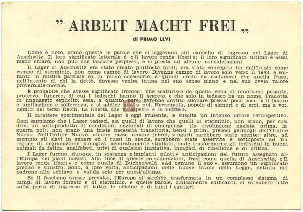 notizie storico-critiche | La cartolina riporta il testo di Primo Levi "Arbeit Macht Frei" |