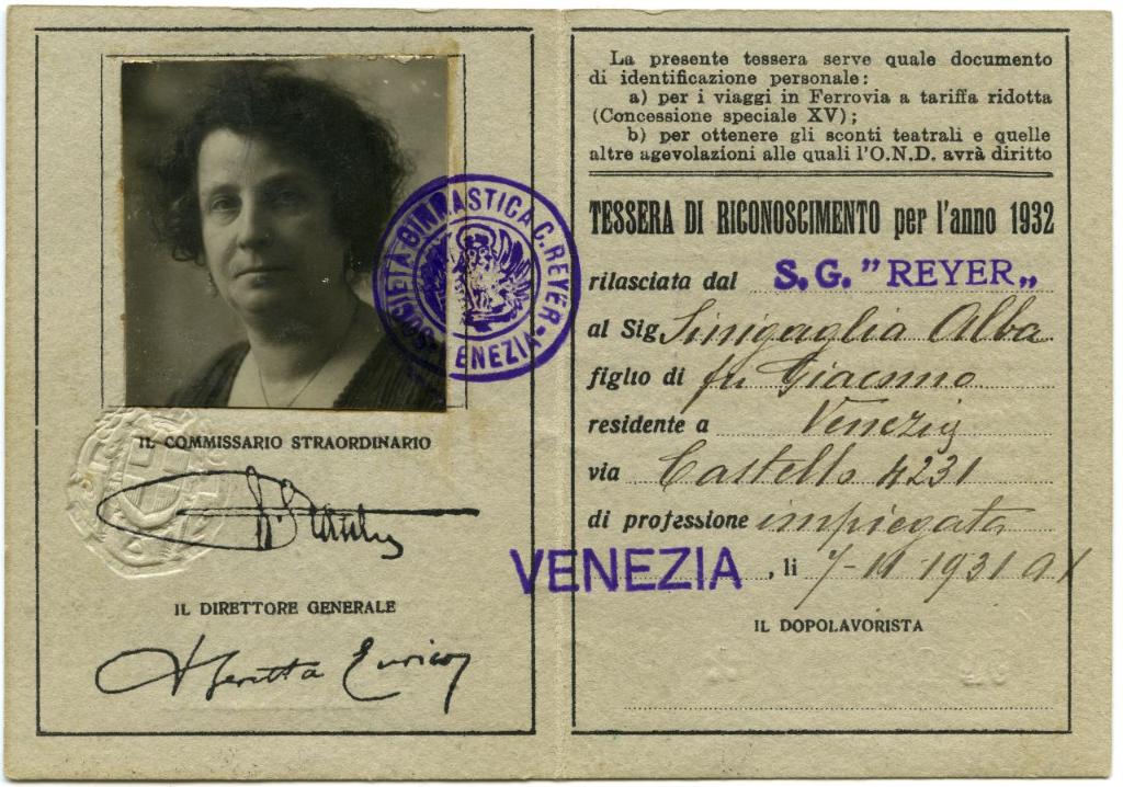 | notizie storico-critiche | La tessera di riconoscimento per l'anno 1932 dell'Opera Nazionale Dopolavoro fu rilasciata il 7 novembre 1921 ad Alba Cesana in Sinigaglia dalla Società Ginnastica "C. Reyer" di Venezia |