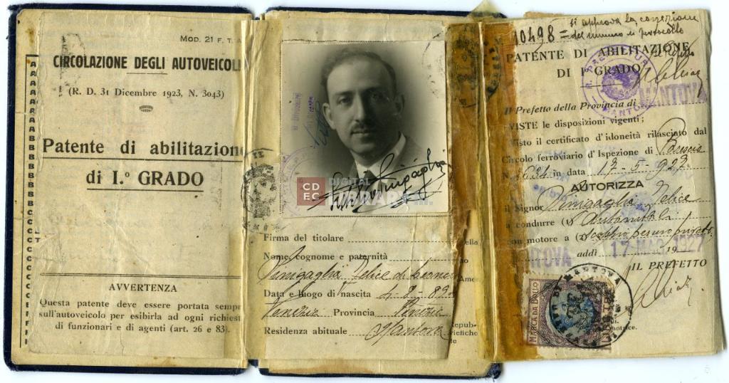 | notizie storico-critiche | Il Prefetto della Provincia di Mantova il 17 maggio 1927 autorizza Felice Sinigaglia alla conduzione di autoveicoli e viene quindi rilasciata la Patente di abilitazione di Primo Grado alla Guida di automobili per uso proprio dal Touring Club Italiano |