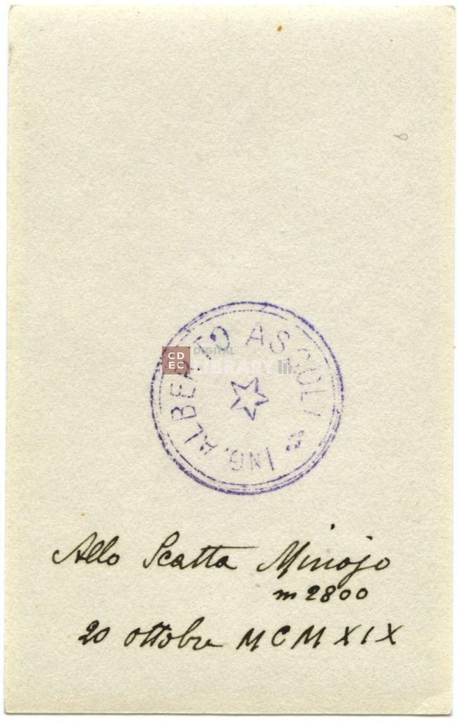 timbri, marchi | sul verso del supporto il timbro di provenienza, in forma circolare a inchiostro blu, con la scritta "Ing. Alberto Ascoli" |