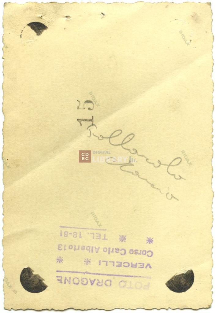 timbri, marchi | sul verso del supporto in basso il timbro a inchiostro blu con il marchio commerciale del fotografo |