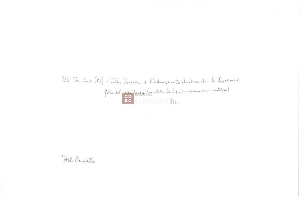 iscrizioni | sul verso del supporto l'indicazione manoscritta al centro "Vo' Vecchio (PD) - Villa Venier e l'adiacente chiesa di S. Lorenzo/ foto del 14/11/2004 (visibile la lapide commemorativa)" e in basso a sinistra "Italo Baratella" |