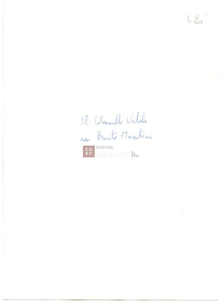 | iscrizioni | sul verso del supporto l'indicazione manoscritta "Il Colonnello Vitale con Benito Mussolini" |