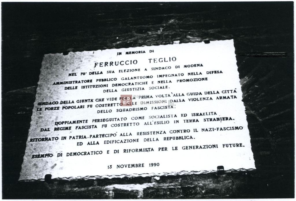| iscrizioni | nell'immagine sulla lapide l'iscrizione "In memoria di Ferruccio Teglio/ nel 70° della sua elezione a sindaco di Modena/ Amministratore pubblico galantuomo impegnato nella difesa delle istituzioni democratiche e nella promozione della giustizia sociale./ Sindaco della giunta che vide per la prima volta alla guida della città le forze popolari fu costretto alle dimissioni dalla violenza armata dello squadrismo fascista./ Doppiamente perseguitato come socialista ed israelita dal regime fascista fu costretto all'esilio in terra straniera./ Ritornato in patria partecipò alla Resistenza con il nazi-fascismo ed alla edificazione della Repubblica./ Esempio di democratico e di riformista per le generazioni future./ 13 novembre 1990" |