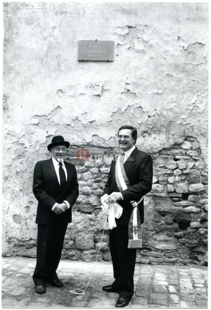 titolo attribuito | Ritratto del rabbino capo Elio Toaff e del sindaco Adolfo Orsini allo scoprimento della targa "Largo Sinagoga" in via del Vingone 9 a Città di Castello |