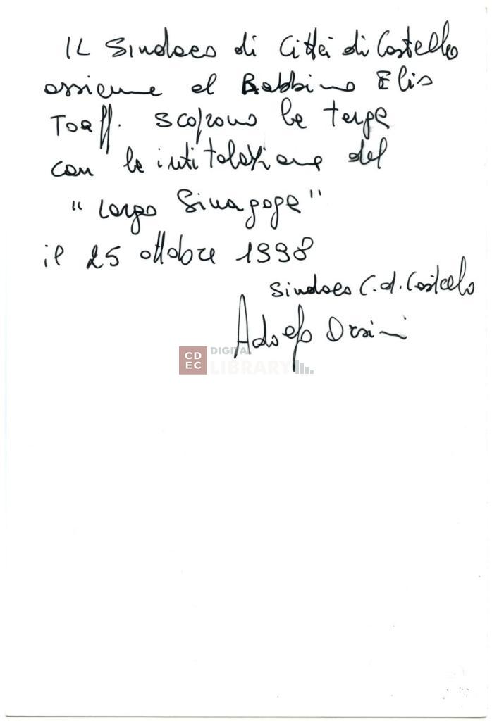iscrizioni | sul verso del supporto la didascalia manoscritta "Il Sindaco di Città di Castello assieme al Rabbino Capo Elio Toaff scoprono la targa con la intitolazione del "Largo Sinagoga"/ 25 ottobre 1998/ Sindaco C. di Castello Adolfo Orsini" |