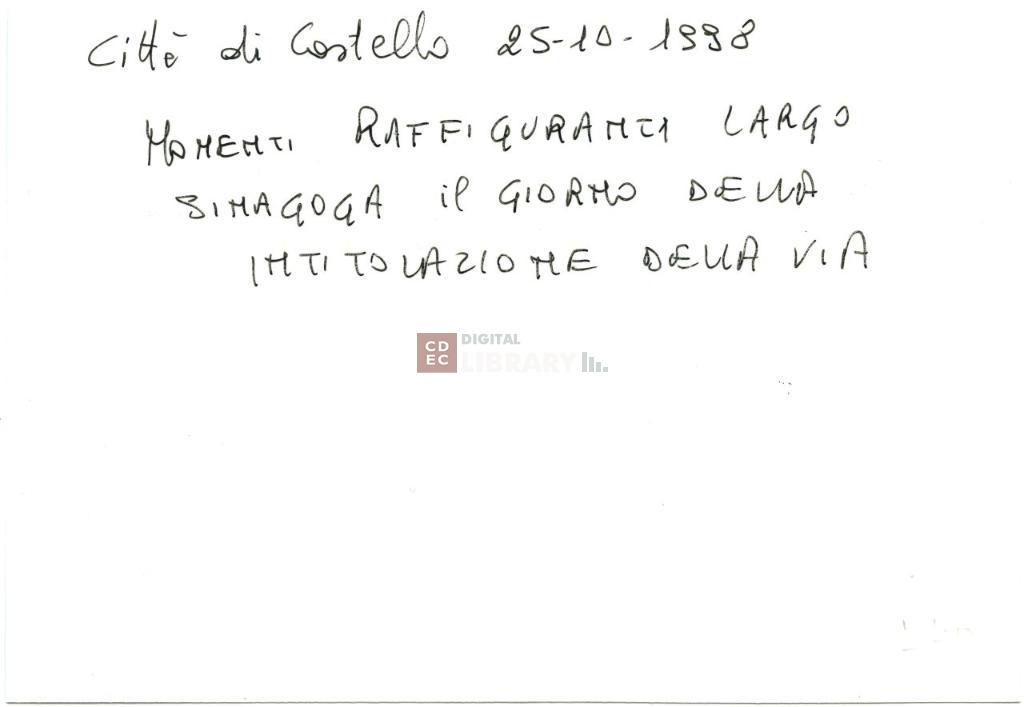 iscrizioni | sul verso del supporto la didascalia manoscritta "Città di Castello 25-10-1998/ Momenti raffiguranti Largo Sinagoga il giorno della intitolazione della via" |