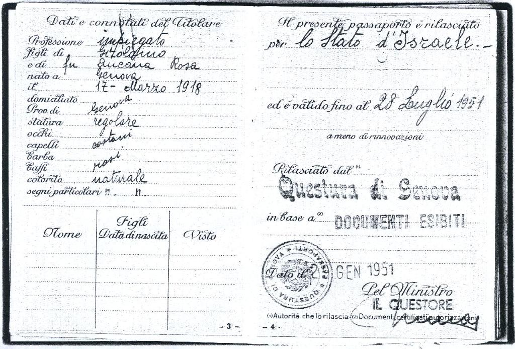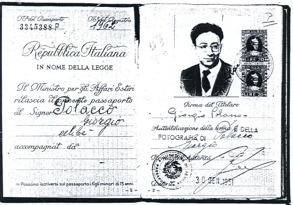 | notizie storico-critiche | Il passaporto della Repubblica italiana fu rilasciato dalla Questura di Genova il 29 gennaio 1951 a Giorgio Polacco "per lo Stato d'Israele" |