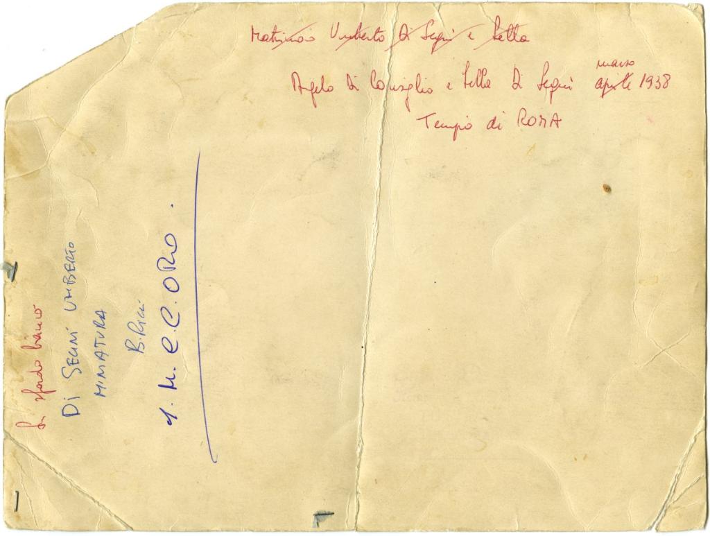 | iscrizioni | sul verso del supporto a sinistra l'indicazione manoscritta "Di Segni Umberto miniatura/ B. Ricci [...]" e in alto l'appunto manoscritto a penna rossa "Angelo Di Consiglio e Lella Di Segni marzo 1938/ Tempio di Roma" |