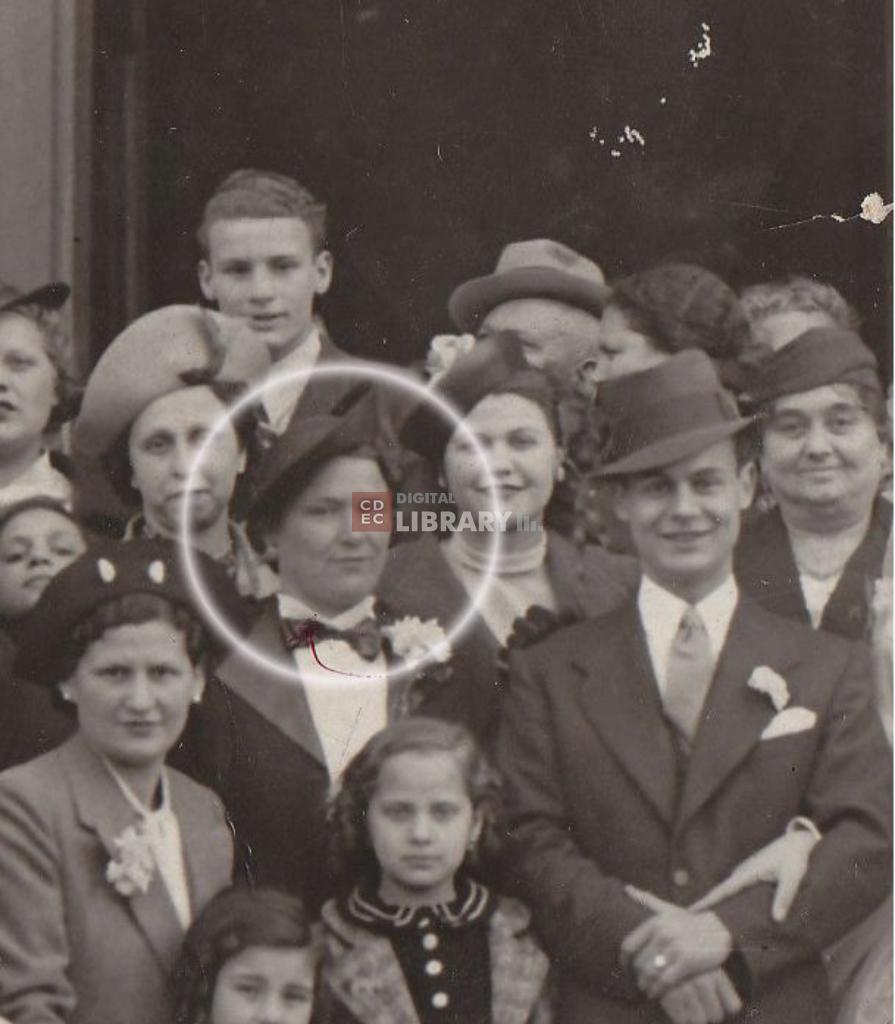 | osservazioni | Al centro a sinistra lo sposo Angelo Di Consiglio e a destra la sposa in abito bianco Lella Di Segni in Di Consiglio; a sinistra in alto il volto scontornato è di Umberto Di Segni mentre alla destra dello sposo è Cesira Perugia in Di Segni (evidenziata dal cerchio) |
