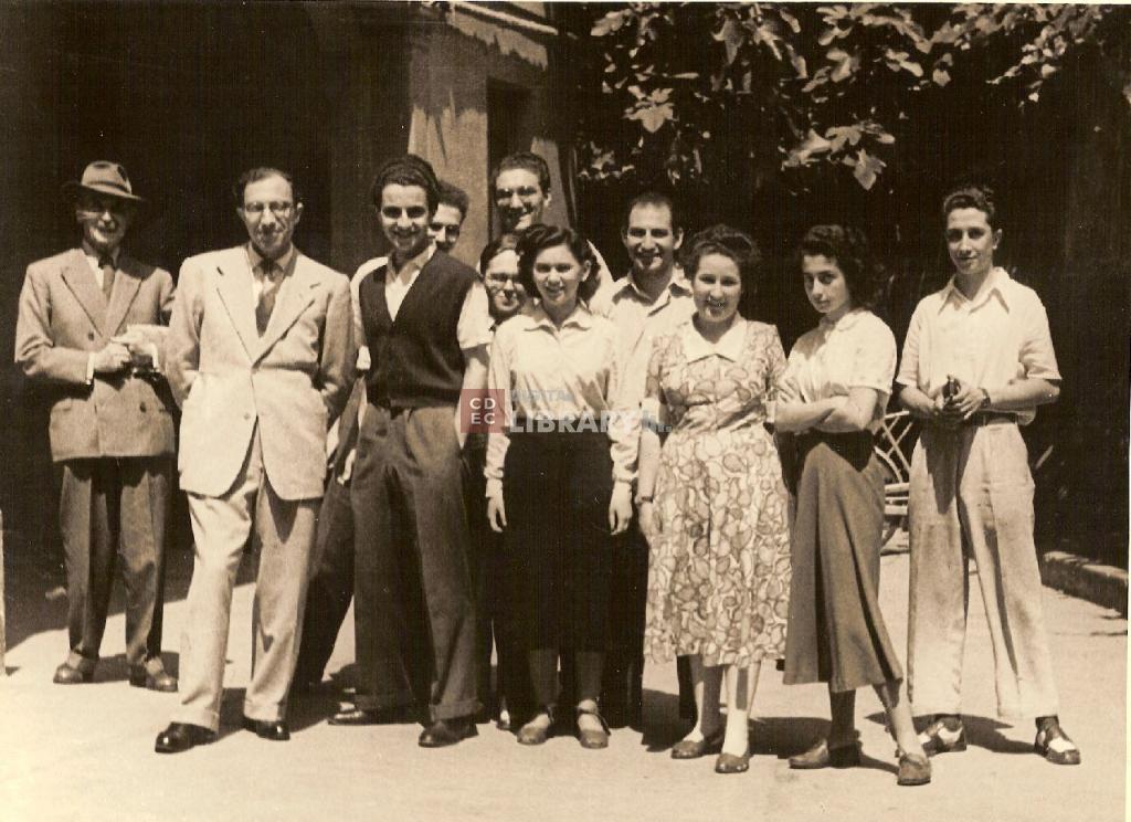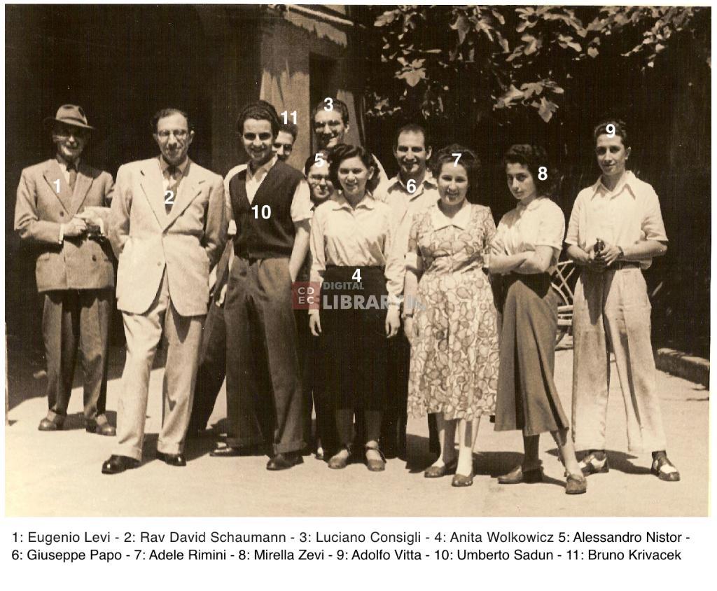 osservazioni | Nella fotografia si riconoscono 1: prof. Eugenio Levi, 2: Rav David Schaumann; 3: Luciano Consigli, 4: Anita Wolkowicz (poi coniugata Schaumann), 5: Alessandro Nistor, 6: Giuseppe Papo, 7: Adele Rimini, 8: Mirella Zevi, 9: Adolfo Vitta, 10: Umberto Sadun, 11: Bruno Krivacek |