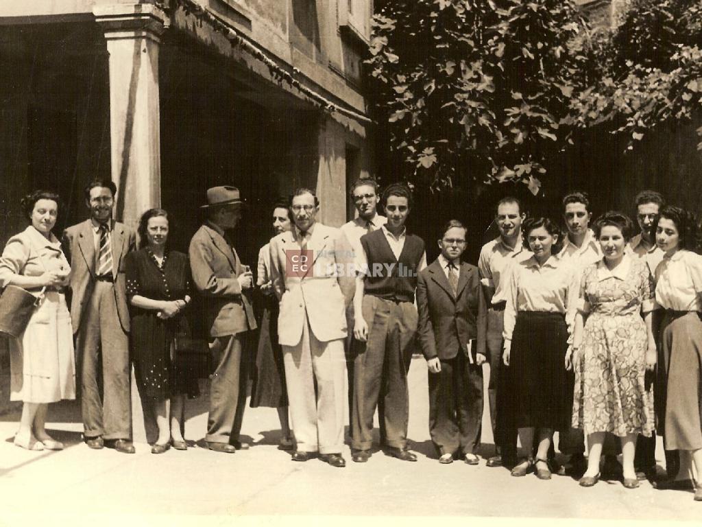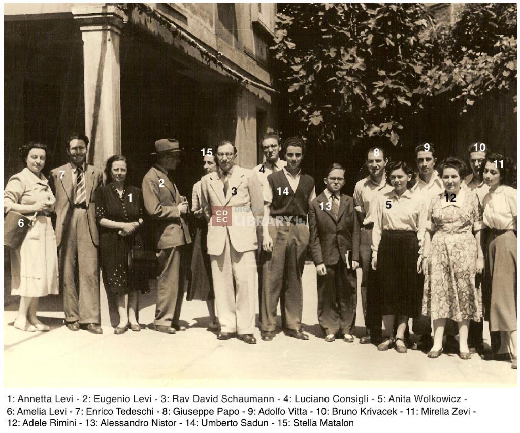 osservazioni | Nella fotografia si riconoscono 1: prof. Annetta Levi, 2: prof. Eugenio Levi (ripreso di profilo), 3: il Preside Rav Avraham David Schaumann, 4: Luciano Consigli, 5: Anita Wolkowicz (poi coniugata Schaumann), 6: prof. Amelia Levi, 7: prof. Enrico Tedeschi, 8: Giuseppe Papo, 9: Adolfo Vita, 10: Bruno Krivacek, 11: Mirella Zevi, 12: Adele Rimini, 13: Alessandro Nistor, 14: Umberto Sadun, 15: prof. Stella Matalon |