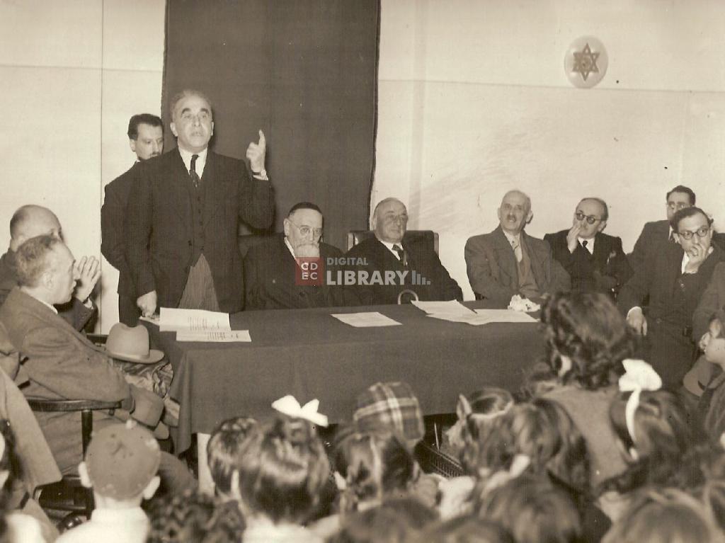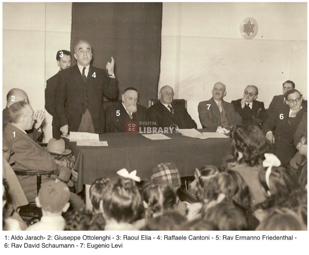 osservazioni | Nella fotografia si riconoscono 1: Aldo Jarach (ripreso di profilo), 2: Giuseppe Ottolenghi (seminascosto), 3: Raoul Elia, 4: Raffaele Cantoni, 5: Rabbino Capo rav Ermanno Friedenthal, 6: il Preside rav Avraham David Schaumann, 7: Eugenio Levi |