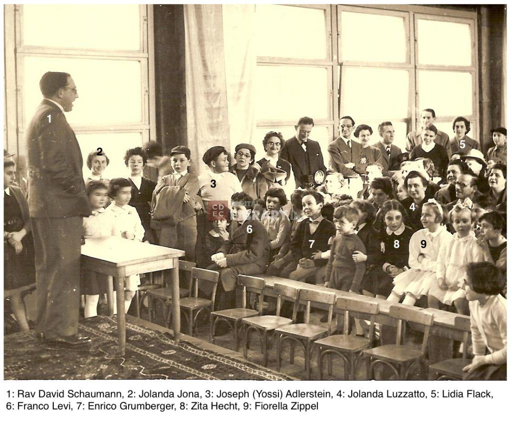 osservazioni | Nella fotografia si riconoscono 1: Rav David Schaumann, 2: Jolanda Jona, 3: Joseph (Yossi) Adlerstein, 4: Jolanda Luzzatto, 5: Lidia Flack, 6: Franco Levi, 7: Enrico Grumberger, 8: Zita Hecht, 9: Fiorella Zippel |