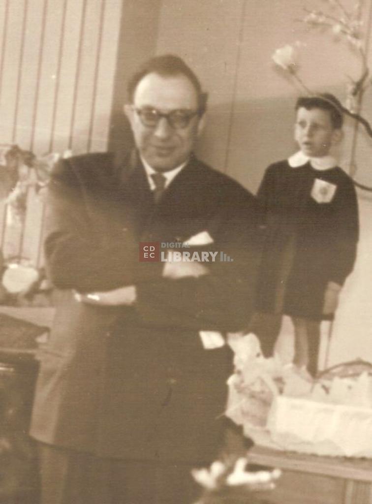 notizie storico-critiche | Il rabbino David Schaumann è preside della scuola ebraica di Milano. Lo scatto fu eseguito in occasione di una recita per la festa di Tu Bishvat, documentata anche da uno scatto conservato nel fondo Bollettino Comunità ebraica di Milano (inv. 133-s110-003) |
