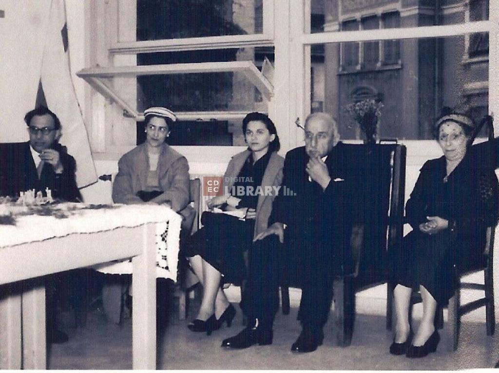 titolo attribuito | Ritratto di Rav David Schaumann, Elena Levi de Veali Mayer, Anita Wolkowicz Schaumann, Sally Mayer e Anna Da Fano Provenzali a un incontro alla scuola ebraica di Milano |