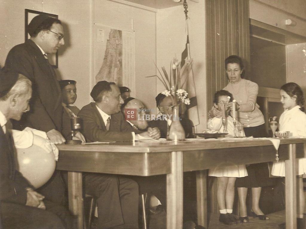 osservazioni | Nella fotografia si riconoscono da sinistra 1: Alfredo Sarano, 2: Rav David Schaumann (in piedi), 3: il "vigile" Enrico Levi (?), 4: Astorre Mayer, 5: Rav Ermanno Friedenthal, 6: la morà Allegra Jacchia |