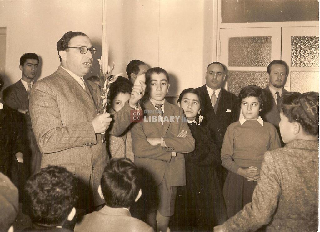 titolo attribuito | Ritratto di Rav David Schaumann con gli studenti della scuola ebraica di Milano durante le celebrazioni per la festività di Succot |