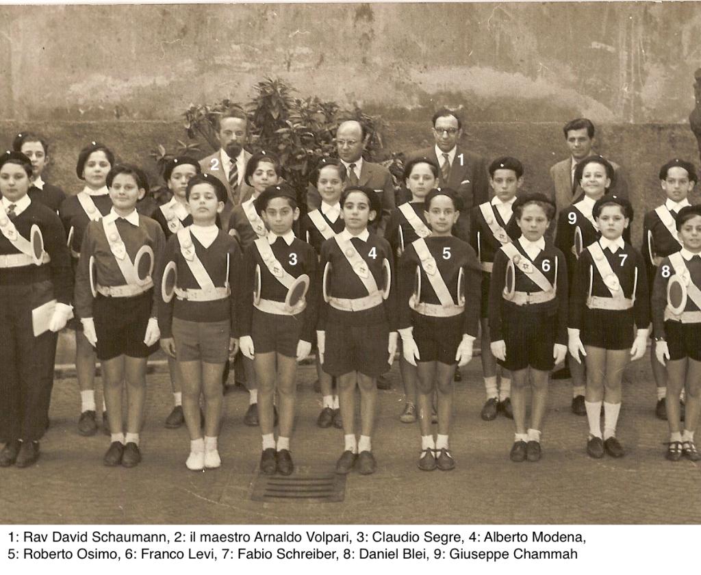 | osservazioni | Nella fotografia si riconoscono in ultima fila gli insegnanti 1: Rav David Schaumann e 2: il maestro Arnaldo Volpari; inoltre sono presenti i "vigili" 3: Claudio Segre, 4: Alberto Modena, 5: Roberto Osimo, 6: Franco Levi, 7: Fabio Schreiber, 8: Daniel Blei, 9: Giuseppe Chammah |