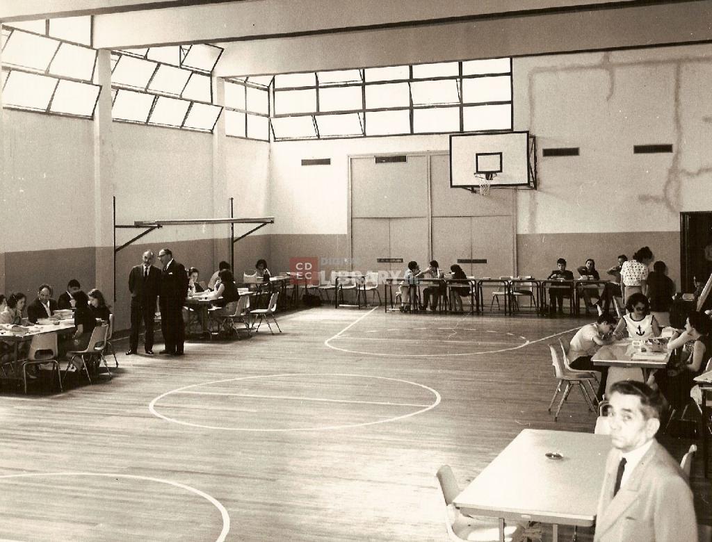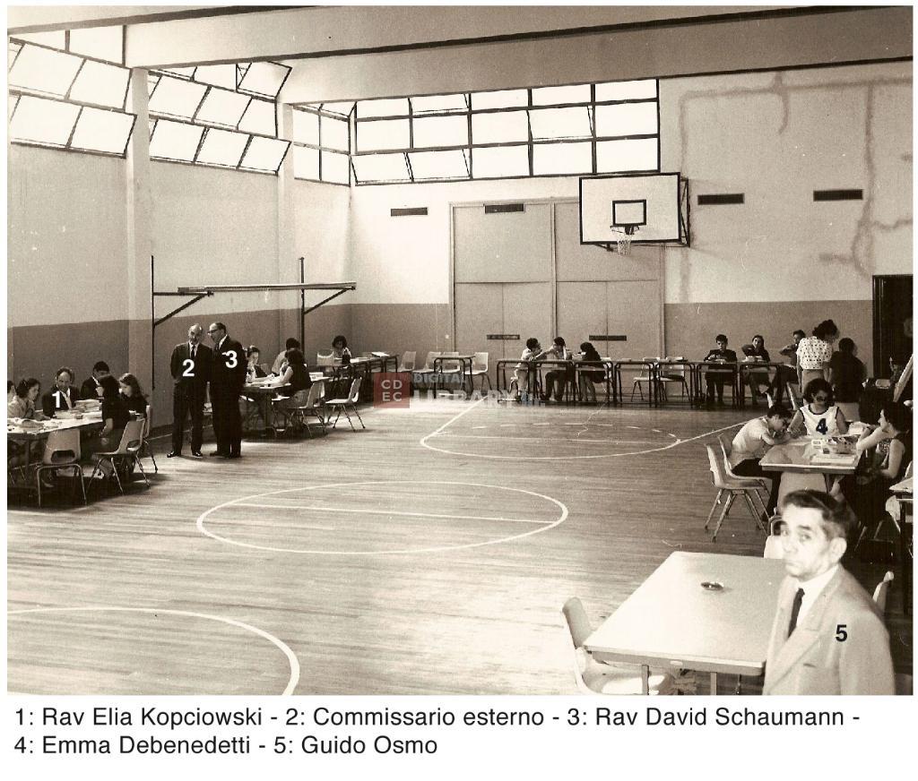 titolo attribuito | Studenti e professori della scuola ebraica di Milano riuniti per l'esame di maturità nella palestra |