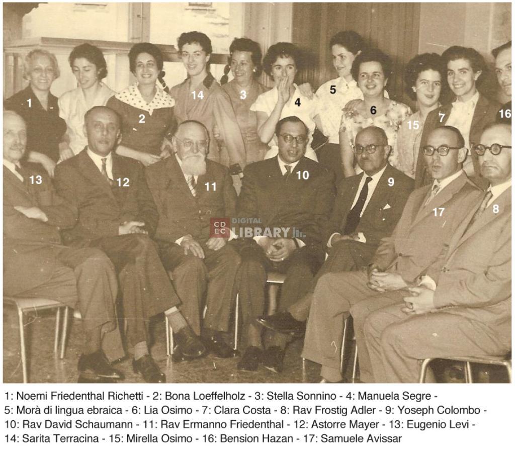 osservazioni | Nella fotografia si riconoscono 1: Noemi Friedenthal in Richetti, 2: Bona Loeffelholz (poi coniugata Cohenca), 3: Stella Sonnino, 4: Manuela Segre, 5: morĂ di lingua ebraica (giunta da Israele), 6: Lia Osimo (poi coniugata Levi), 7: Clara Costa in Kopciowski, 8: Rav Frostig Adler, 9: Yoseph Colombo, 10: Rav Avraham David Schaumann, 11: Rav Ermanno Friedenthal, 12: Astorre Mayer, 13: Eugenio Levi, 14: Sarita Terracina, 15: Mirella Osimo, 16: Bension Hazan, 17: Samuele Avissar |