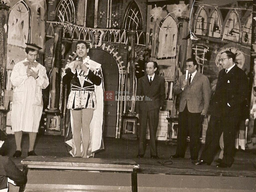 titolo attribuito | Ritratto di Cino Tortorella, in arte Mago Zurlì, con Rav David Schaumann e altri allo spettacolo per Purim della scuola ebraica di Milano al Teatro Smeraldo di Milano |