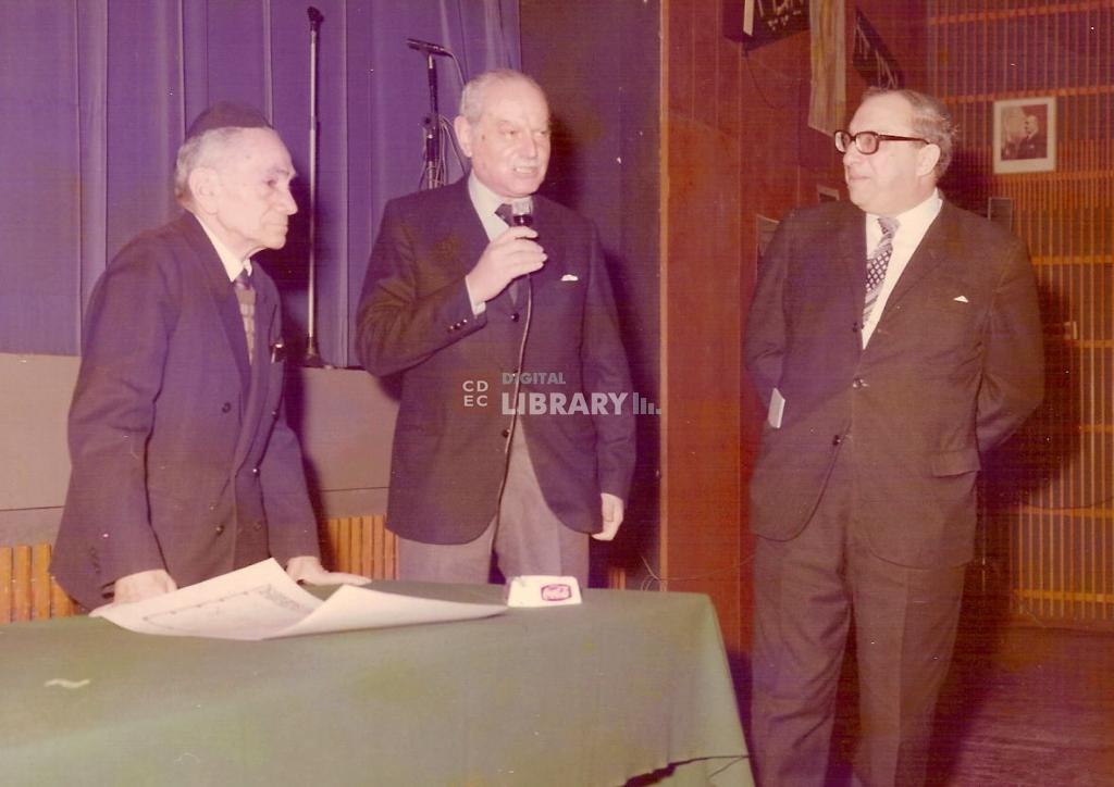 titolo attribuito | Ritratto del Presidente Guido Jarach e del Preside David Schaumann alla cerimonia di consegna della benemerenza a Zaccaria Osmo nell'Aula Magna della scuola ebraica di Milano |