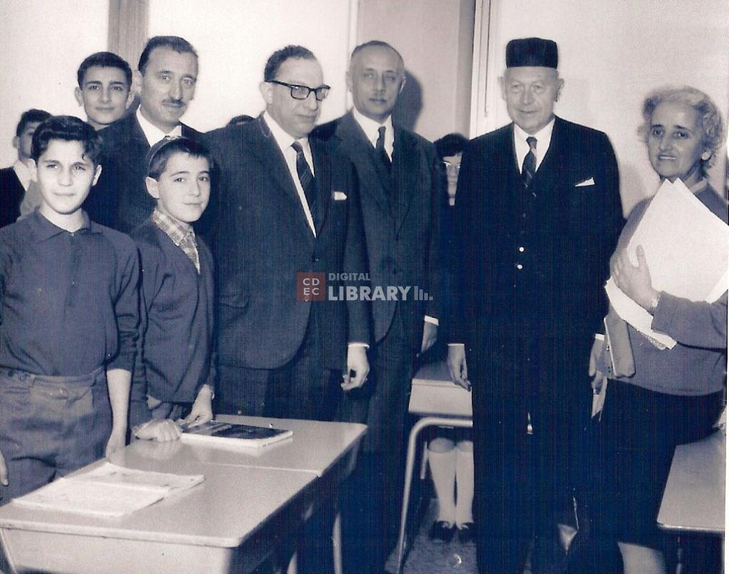 titolo attribuito | Ritratto di Rav David Schaumann, Astorre Mayer e altri durante la cerimonia di congedo di Avram Goldstein Goren nella scuola ebraica di Milano |