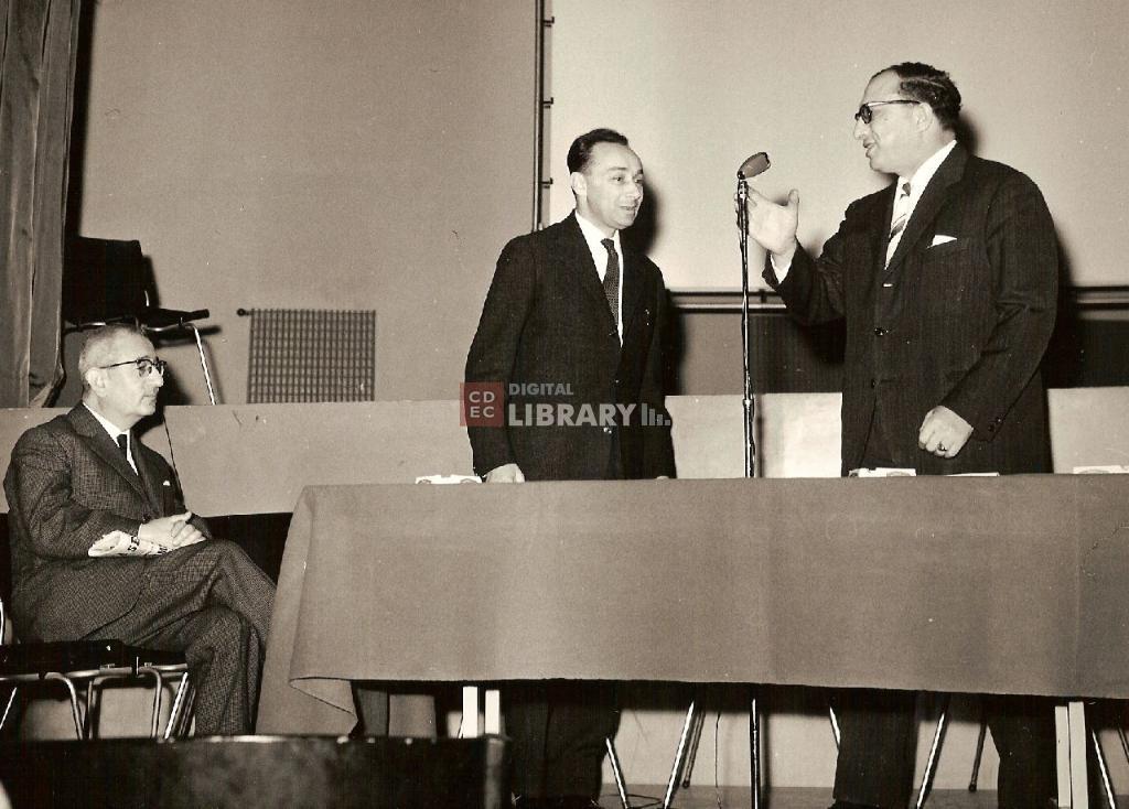 titolo attribuito | Ritratto di Primo Levi con il Preside David Schaumann e Ruggero Norsa durante un incontro alla scuola ebraica di Milano |