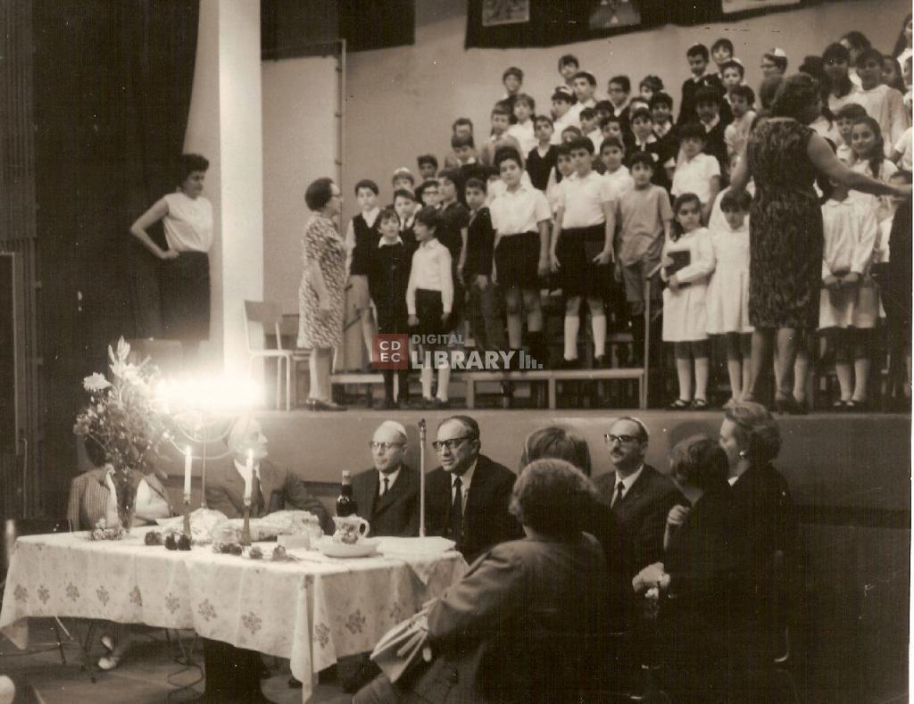 osservazioni | ai piedi del palco, seduto al tavolo quarto da sinistra il preside Rav David Schaumann; sul palco a sinistra la morà Adriana Ottolenghi in Schlumper, seguita dalla morà Noemi Friedenthal in Richetti (accanto agli allievi) e a destra la morà Jole Molco |