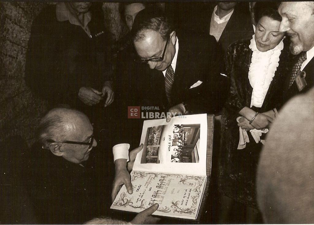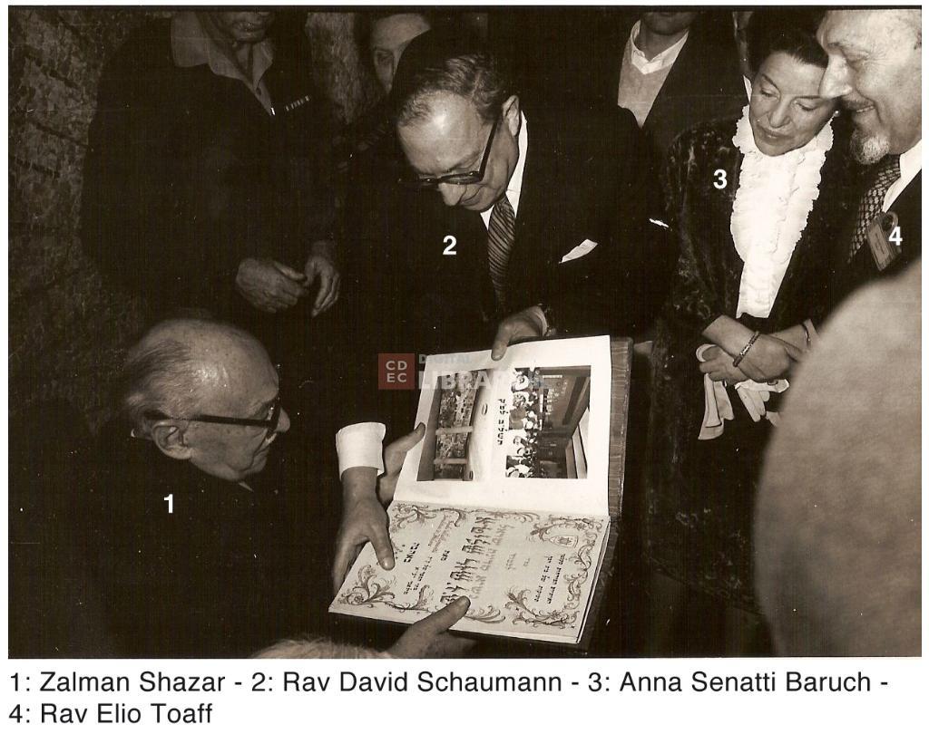 osservazioni | Nella fotografia si riconoscono 1: Presidente Zalman Shazar, 2: Rav Avraham David Schaumann (con il volume in mano), 3: Anna Senatti in Baruch, 4: Rav Elio Toaff (di profilo) |