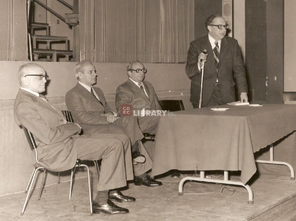 titolo attribuito | Ritratto del Presidente Navon con il Preside Schaumann, l'assessore Pinto e il Console Nahmias durante un incontro nell'Aula Magna della scuola ebraica di Milano |