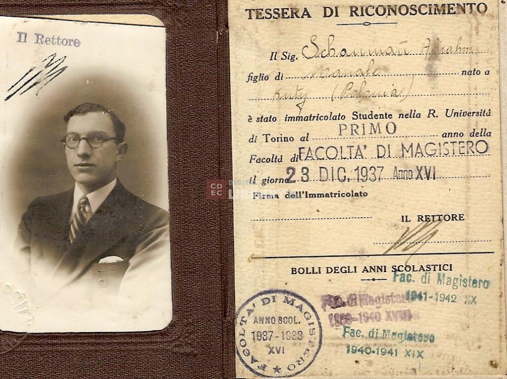 notizie storico-critiche | Avraham Schaumann il 23 dicembre 1937 risulta iscritto al primo anno della Facoltà di Magistero della R. Università di Torino, dove si laureerà il 1° dicembre 1942 in Lettere Moderne con una tesi su "Contra Apionem" di Flavio Giuseppe. |
