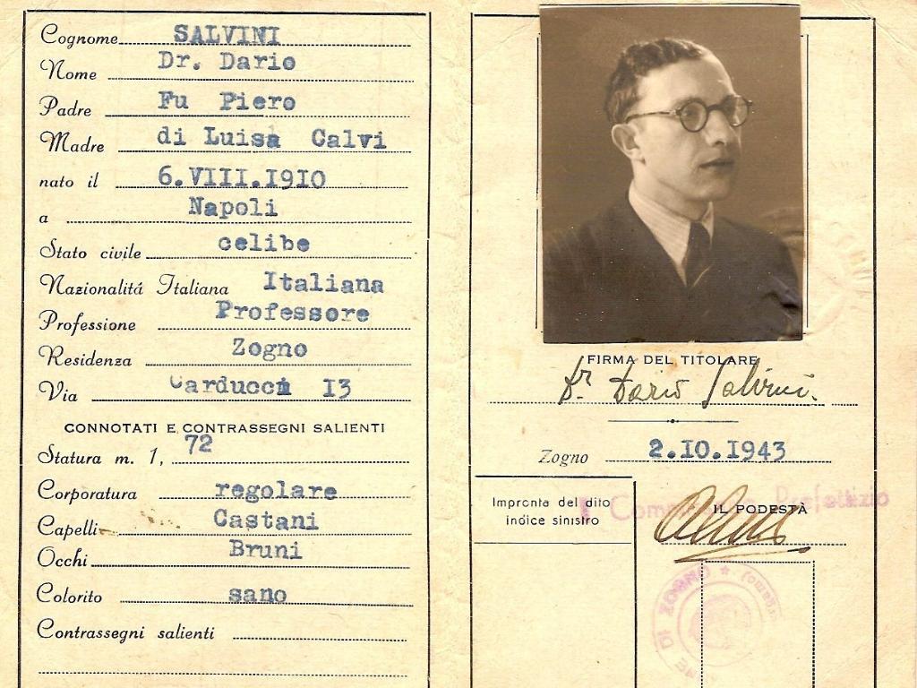 notizie storico-critiche | Il documento di riconoscimento di Abraham David Schaumann riporta le false generalità di Dario Salvini, figlio di Piero e Luisa Calvi e residente a Zogno in provincia di Bergamo; fu utilizzato per rifugiarsi in Svizzera durante le leggi razziali |