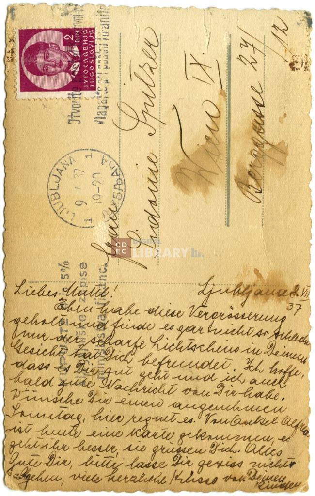 iscrizioni | sul verso del supporto il testo manoscritto da Greta Spitzer "Ljubljana 8.VII.37/ Liebe Mutti! Eben habe diese Vergrößerung geholt und finde es gar nicht so schlecht,nur der scharfe Lichtschein in deinem Gesicht hat die befremdet .Ich hoffe ,dass es Dir gut geht und ich auch bald gute Nachricht von Dir habe. Wünsche Dir einen angenehmen Sonntag,hier regnet es.Von Onkel Alfred ist heute eine Karte gekommen, es geht ihr besser, sie grüßen Dich. Alles Gute Dir, bitte lass Dir gewiss nichts abgehen,viele herzliche Küsse von Deinen Kindern" [Trad. "Lubiana, 8.VII.37/ Cara mamma! Ho appena ricevuto questo ingrandimento e penso che non sia male, solo la luce tagliente sul tuo viso era strana. Spero che tu stia bene e che presto avrò buone notizie da te. Ti auguro una buona domenica, qui sta piovendo. Un biglietto è arrivato oggi da zio Alfred, sta meglio, ti salutano. Tutto il meglio per te, per favore assicurati di godere la vita, molti baci calorosi dai tuoi Bambini"] e l'indirizzo "Frau Sidonie Spitzer/ Wien IX/ Berggasse 27/12" |