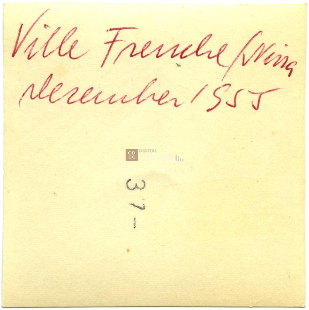 iscrizioni | sul verso del supporto l'indicazione a penna rossa "Ville Frenche [sic]/Nizza december 1955" |