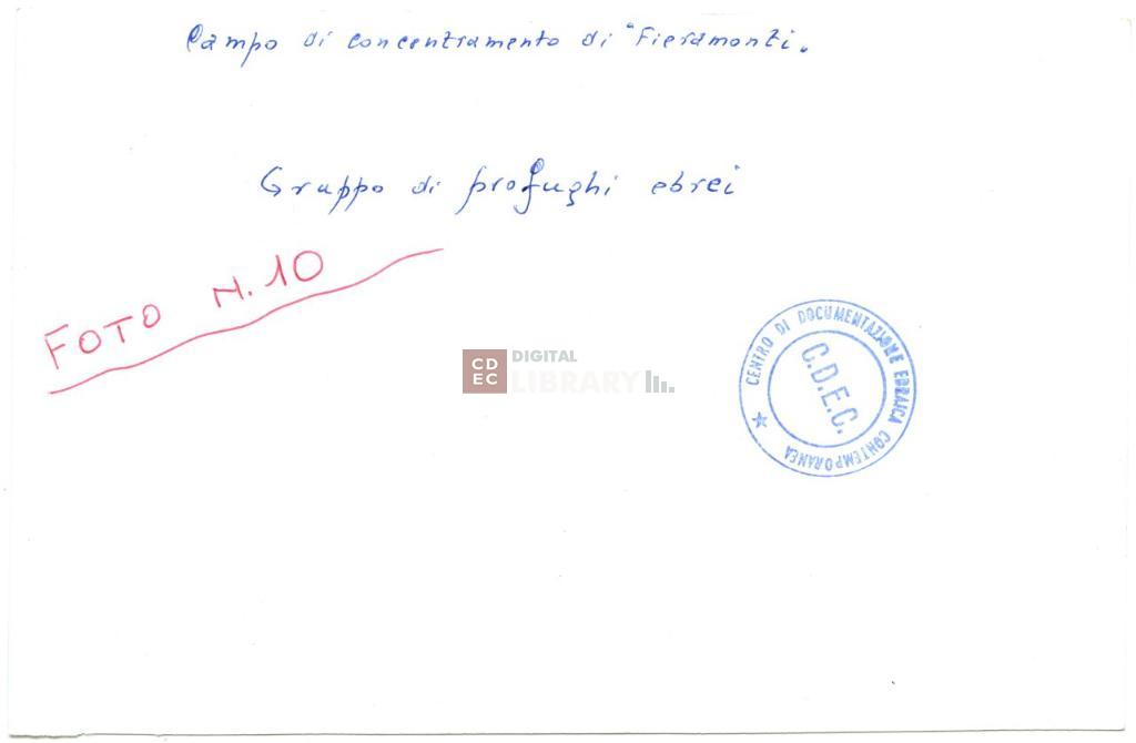 | iscrizioni | sul verso del supporto la scritta a penna rossa "Foto n. 10" e la scritta a penna blu "Campo di concentramento di "Ferramonti"/ Gruppo di profughi ebrei" |