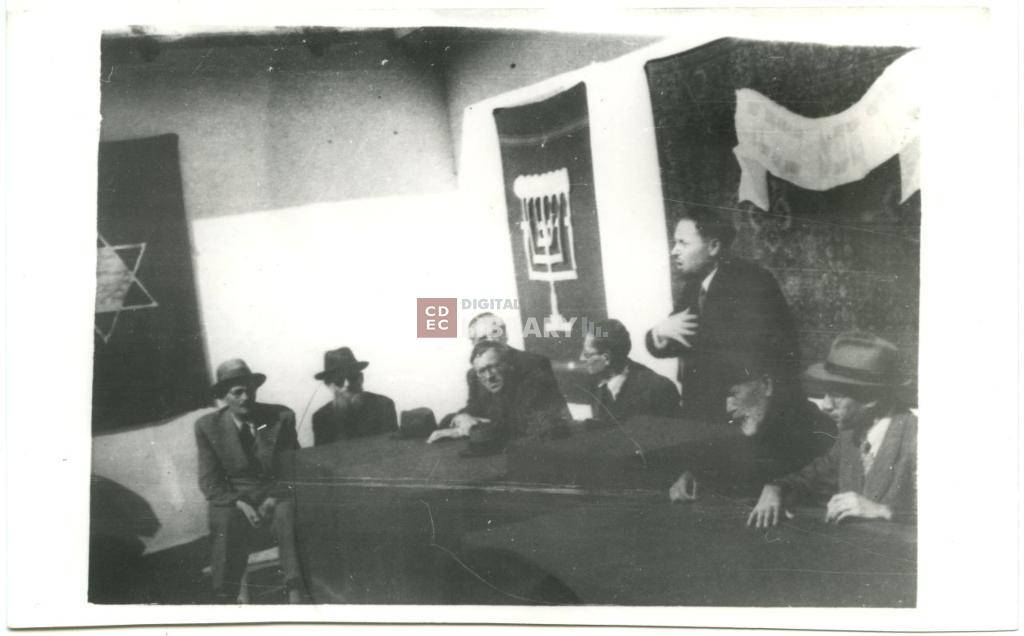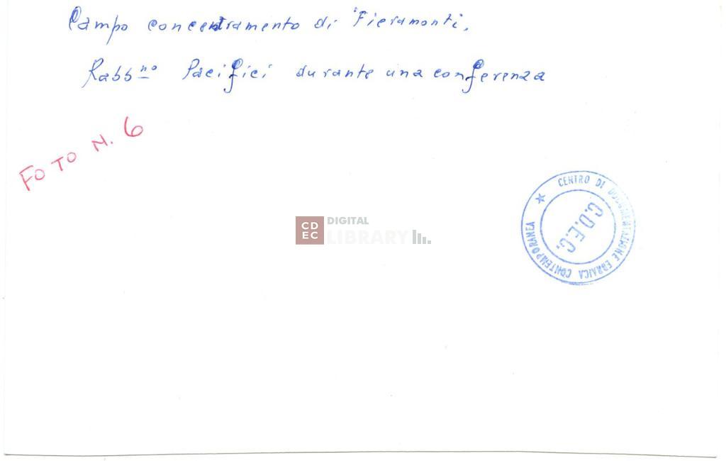 | iscrizioni | sul verso del supporto le scritte a penna rossa "Foto n. 6" e a penna blu "Campo di concentramento di "Ferramonti"/ Rabb.no Pacifici durante una conferenza" |