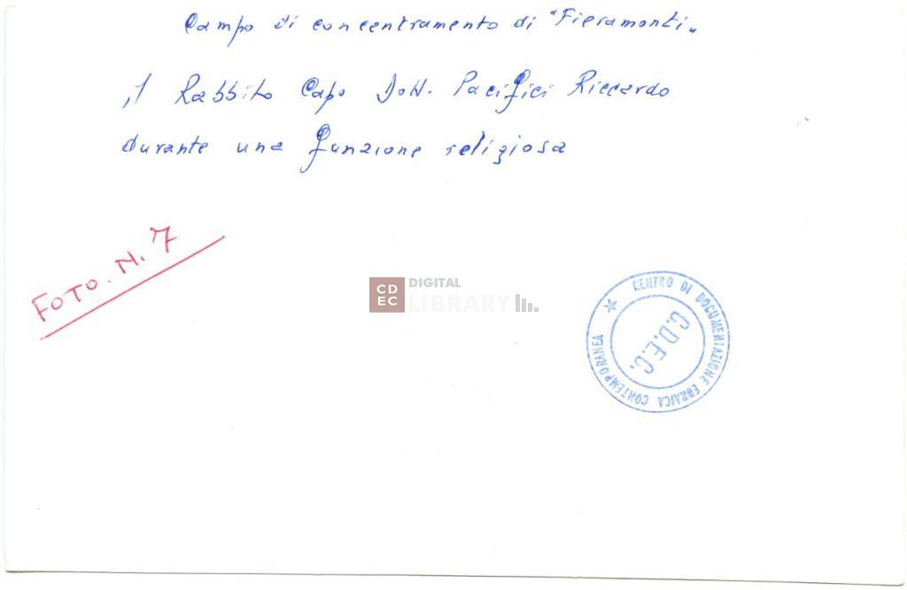 | iscrizioni | sul verso del supporto le scritte a penna rossa "Foto n. 7" e a penna blu "Campo di concentramento di "Ferramonti"/ Il Rabbino Capo Dott. Pacifici Riccardo durante una funzione religiosa" |