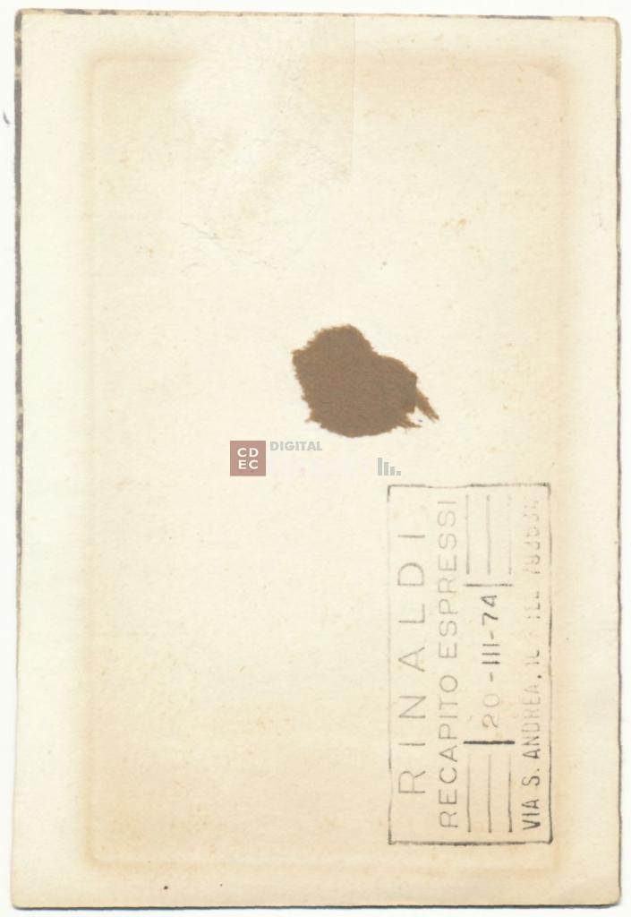 timbri, marchi | sul verso del supporto secondario il timbro rettangolare con la scritta "Rinaldi/ Recapito espressi/ 20-III-74/ via S. Andrea 10 Tel. 793584" |
