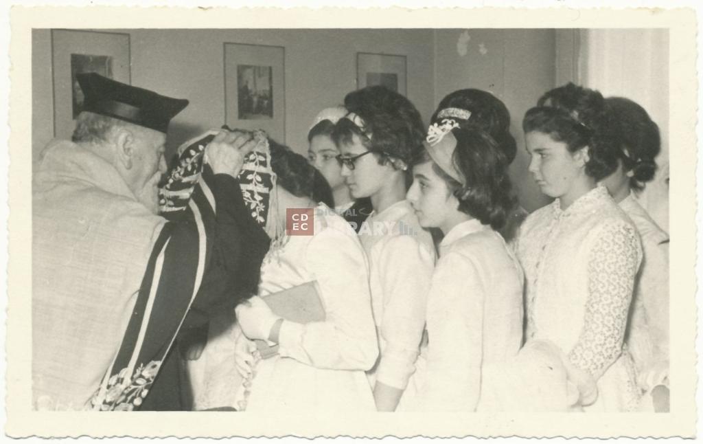 notizie storico-critiche | Un momento della cerimonia del Bat Mitzvà nel Tempio di via Guastalla a Milano: il Rabbino Capo Ermanno Friedenthal impartisce la Berachà alle Benot Mitzvà tra cui Margherita Stern, Bella Horowitz e Liliana Ghitis. La fotografia fu donata da quest'ultima a Rav Elia Richetti nel 1995, come indicato dal biglietto accluso. |