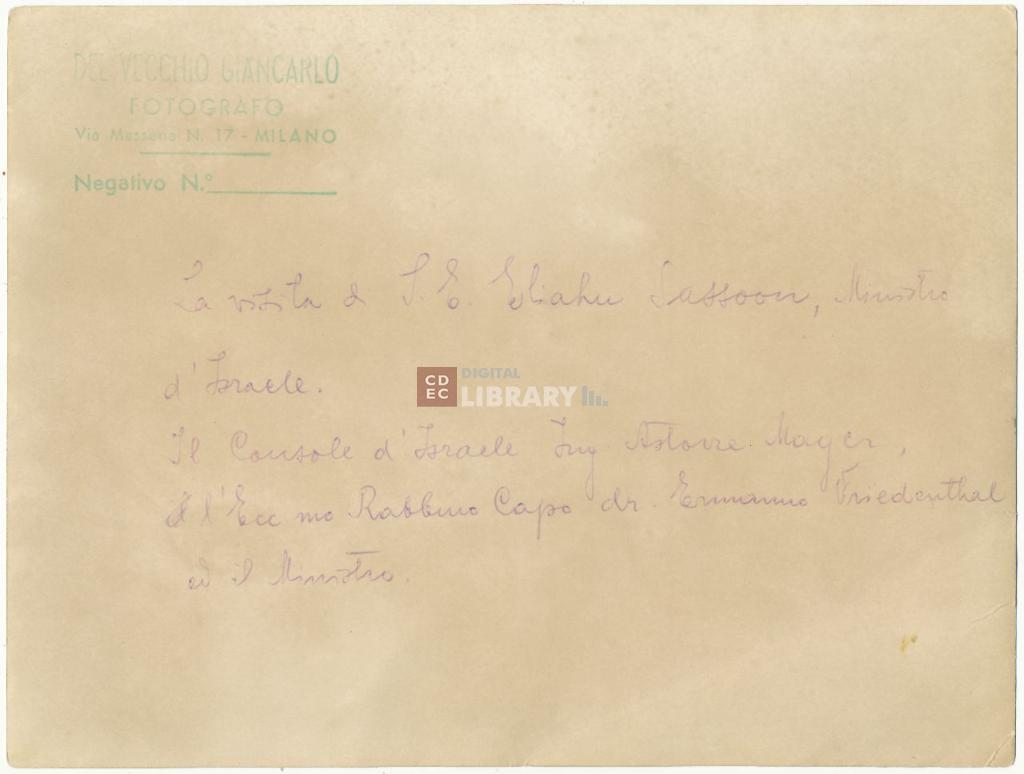 iscrizioni | sul verso del supporto la didascalia manoscritta "La visita di S.E. Elihau Sassoon [sic], Ministro d'Israele./ Il Console d'Israele Ing. Astorre Mayer, l'Ecc.mo Rabbino Capo dr. Ermanno Friedenthal ed il Ministro" |