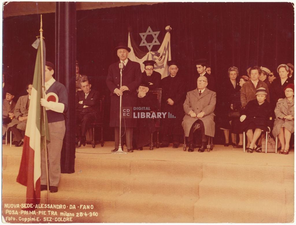 notizie storico-critiche | Il 28 aprile 1960 si tenne la cerimonia della posa della prima pietra della nuova scuola ebraica di Milano, in via Sally Mayer. Vi parteciparono tra gli altri il Rabbino Capo Ermanno Friedenthal e il Sindaco di Milano Virgilio Ferrari. Venne invitato anche il corpo dei "vigili della scuola", che era stato promosso dall'insegnante di Educazione fisica prof. Guido Volpari |
