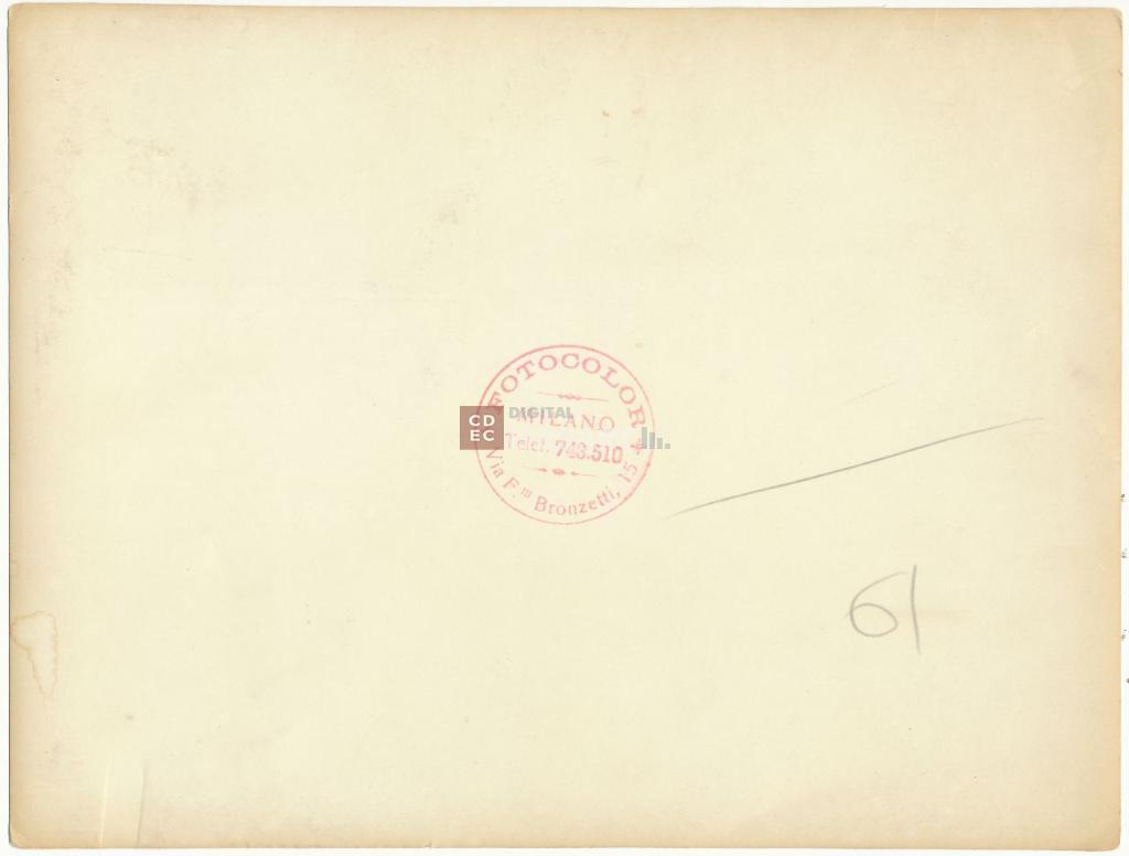 timbri, marchi | sul recto del supporto il timbro circolare a inchiostro rosso con la scritta "Fotocolor - via F.lli Bronzetti 15 - Milano Telef. 743.510" |